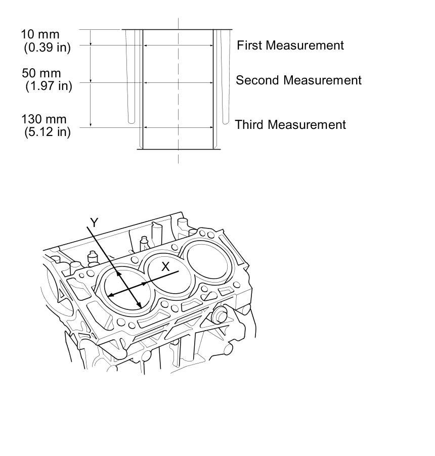 4. Measure the wear and taper in direction X and Y at three levels in each cylinder as shown.