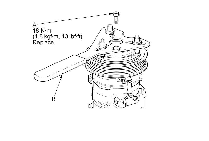 1. Remove the center bolt (A) while holding the pressure plate with the A/C clutch holder (B).