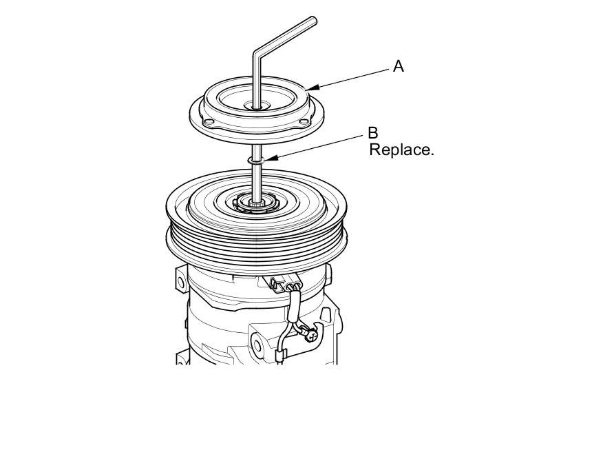 3. If you are replacing the field coil, remove the snap ring (A) with snap ring pliers, then remove the pulley (B). Be careful not to damage the pulley or the A/C compressor.