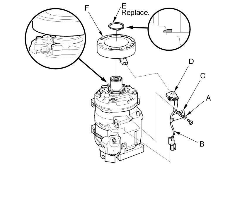4. Remove the screw from the field coil ground terminal (A), then remove the wire harness (B) and the bracket (C). Disconnect the field coil connector (D). Remove the snap ring (E) with snap ring pliers, then remove the field coil (F). Be careful not to damage the field coil or the A/C compressor.