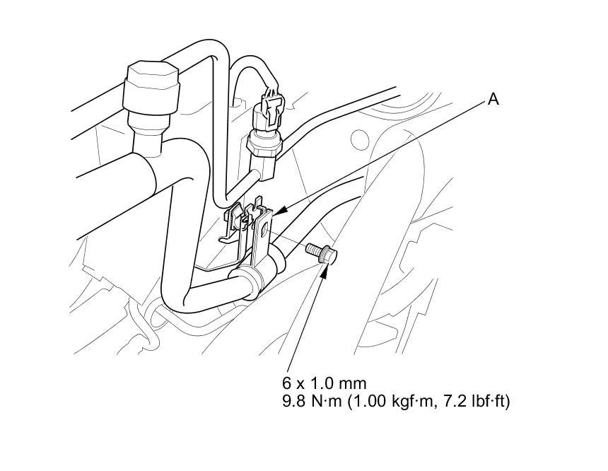2. Remove the bolt from the A/C line clamp (A).