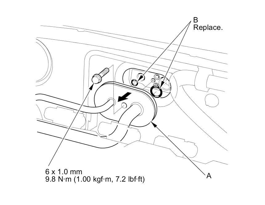 3. Remove the bolt, then disconnect the A/C line (A) from the evaporator core. Replace the O-rings (B).