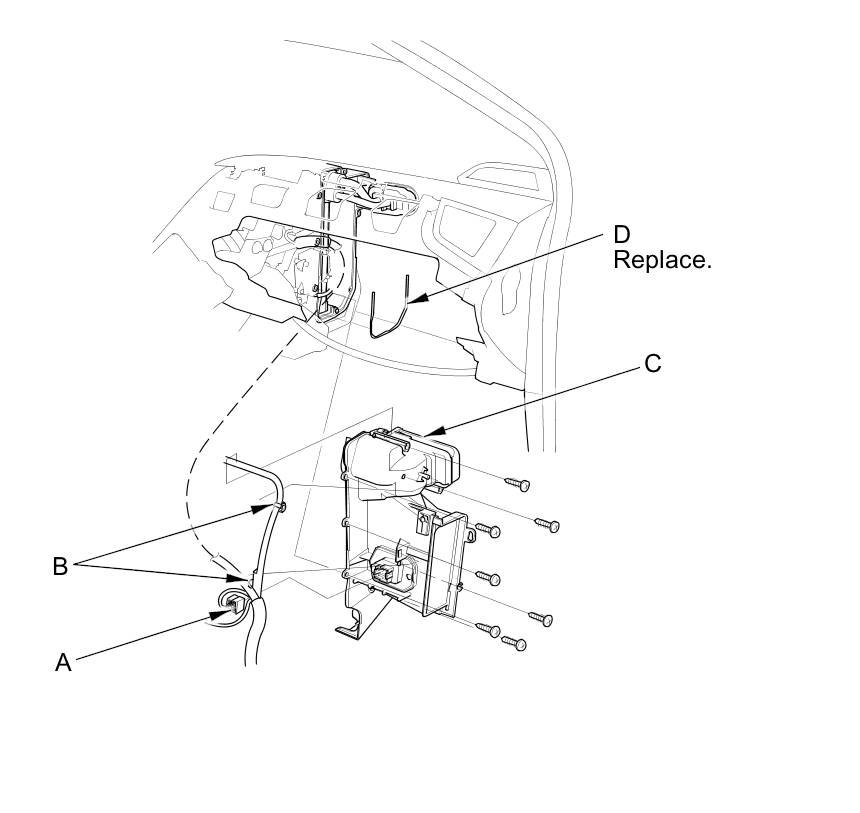 5. Disconnect the power transistor connector (A). Detach the harness clips (B). Remove the self-tapping screws, the joint duct (C), and the seal (D).