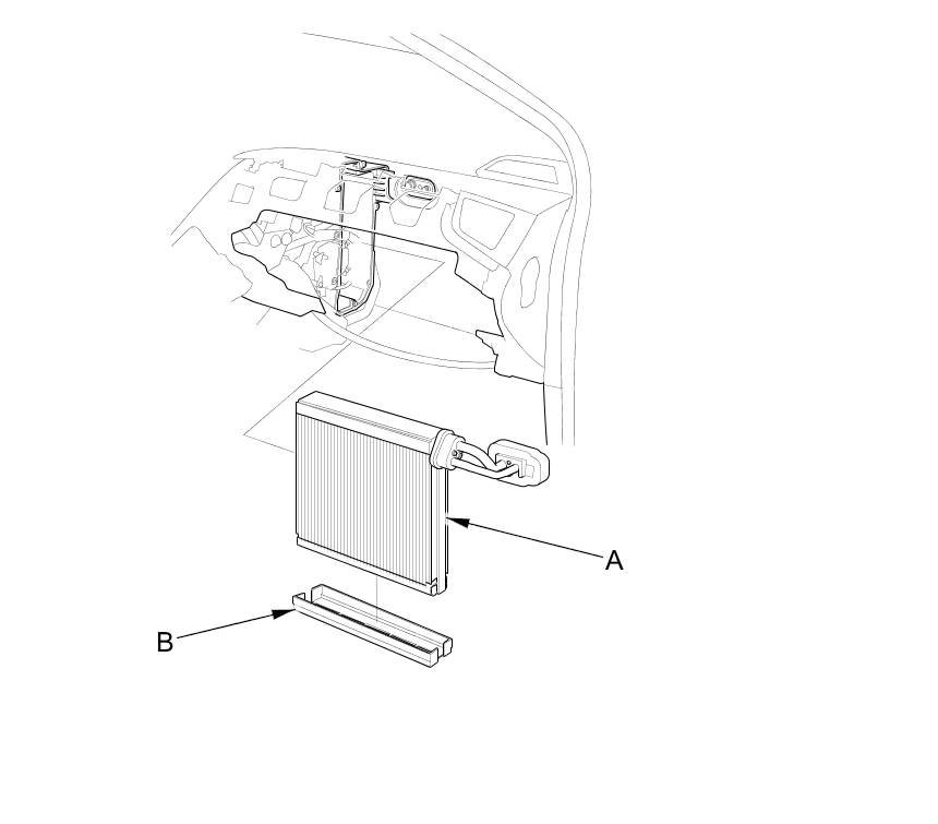 6. Carefully pull out the evaporator core (A) without bending the lines, then remove the plate (B).