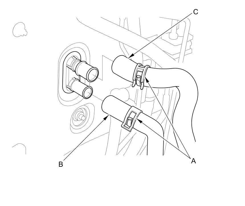 5. From under the hood, slide the hose clamps (A) back. Disconnect the inlet heater hose (B) and the outlet heater hose (C) from the heater unit. Note the layout of the hoses.