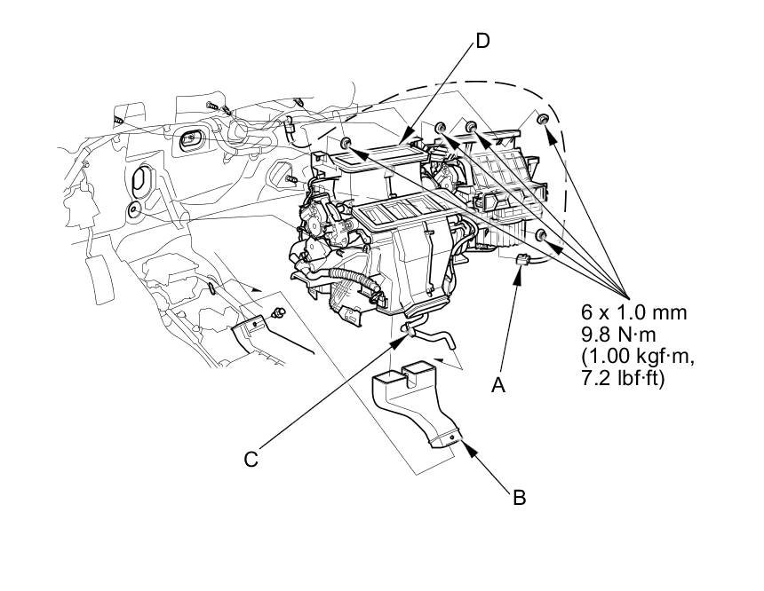 13. Remove the self-tapping screws, the passenger's heater duct (A), the joint duct (B), the seal (C), and the heater core cover (D).