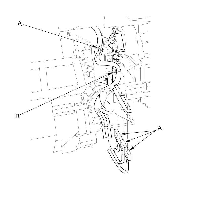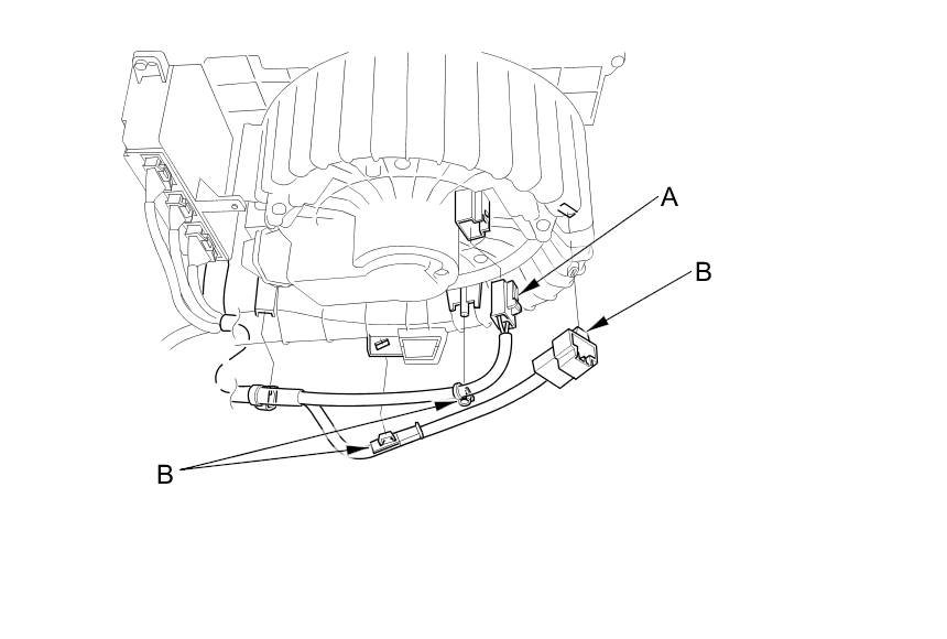 9. Disconnect the connector (A) from the blower motor. Detach the harness clips (B).