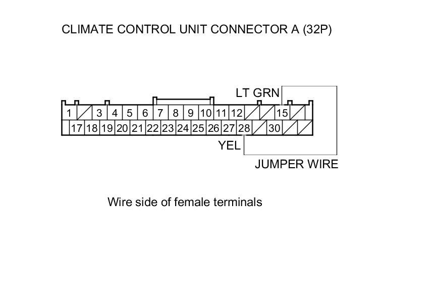 6. Connect climate control unit connector A (32P) terminals No. 15 and No. 28 with a jumper wire.