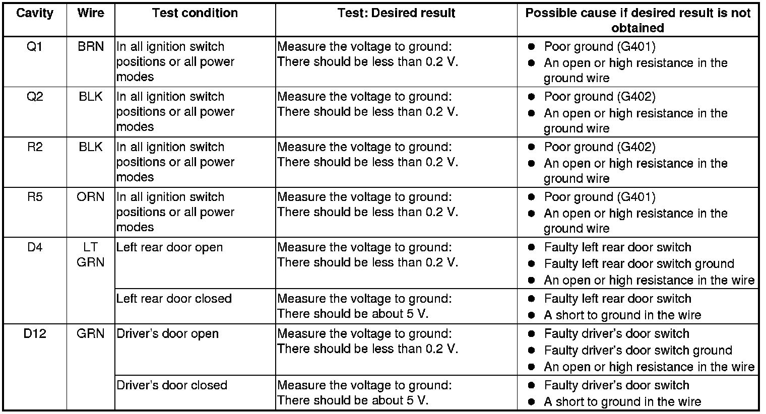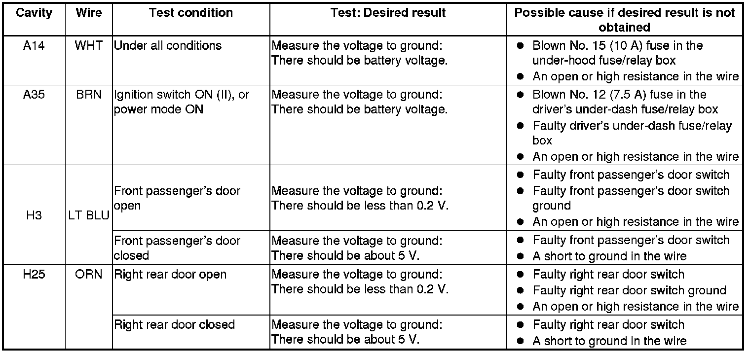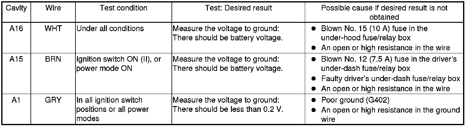 - Before testing, make sure the No.12 (7.5 A) fuse in the driver's under-dash fuse/relay box is OK.