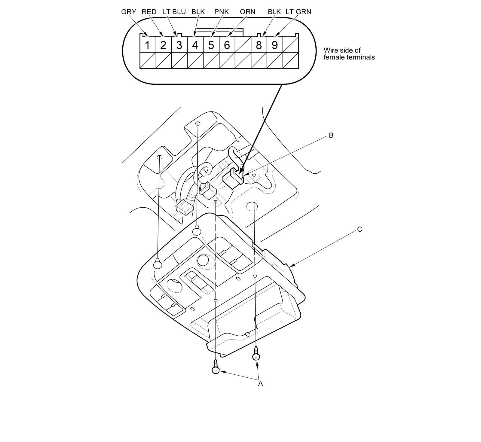 3. Disconnect the 20P connector (B) from the roof console (C).