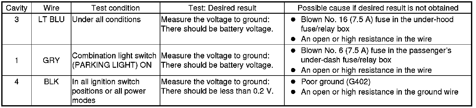 6. Reconnect the connector to the roof console, and do the following input tests: