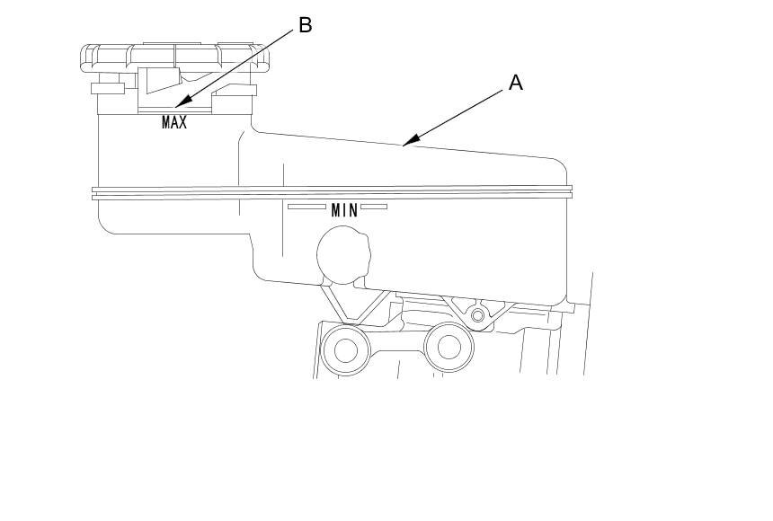 1. Make sure the brake fluid level in the reservoir (A) is at the MAX (upper) level line (B).