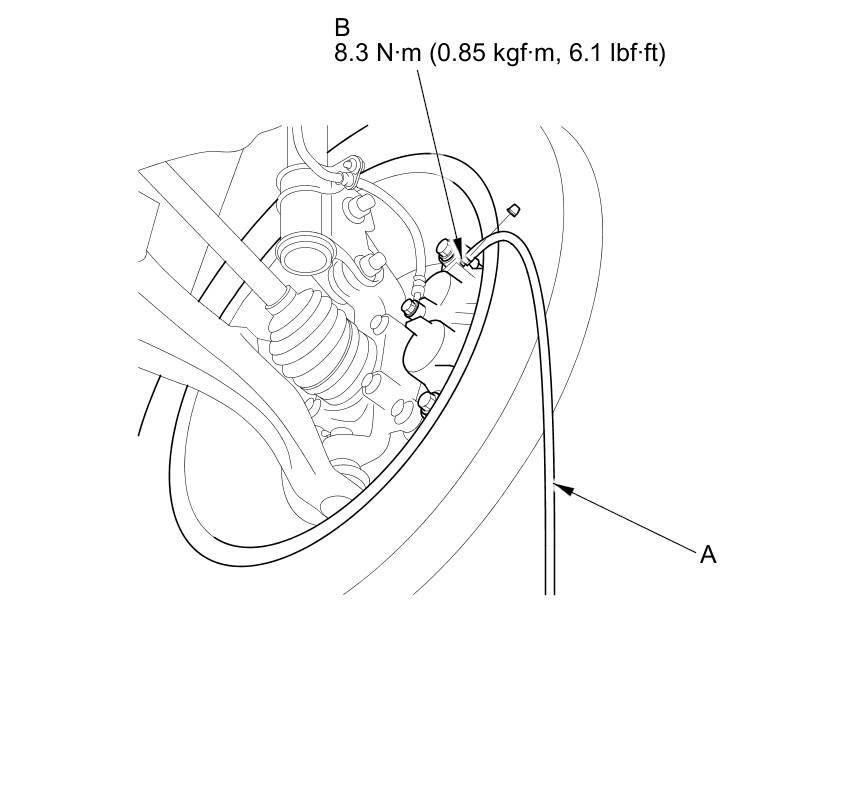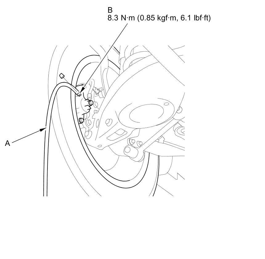 4. Attach a length of clear drain tube (A) to the bleed screw (B), then loosen the bleed screw to allow air to escape from the system. Then tighten the bleed screw securely.