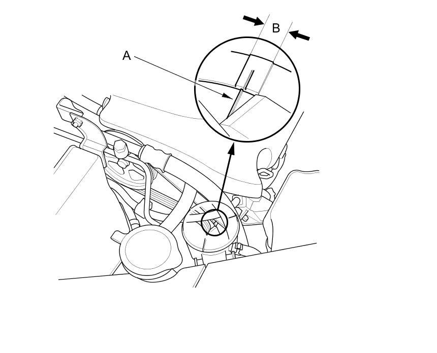 2. Check that the position of the auto-tensioner indicator (A) is within the standard range (B) as shown. If it is out of the standard range, replace the drive belt Service and Repair.