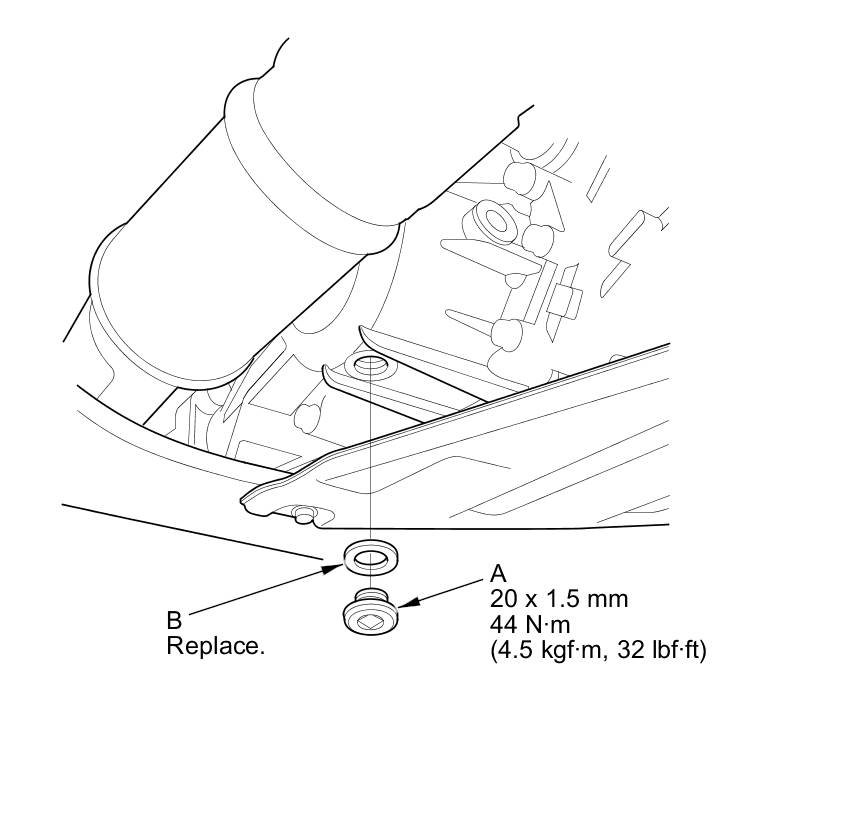 5. Reinstall the drain plug with a new sealing washer (B).