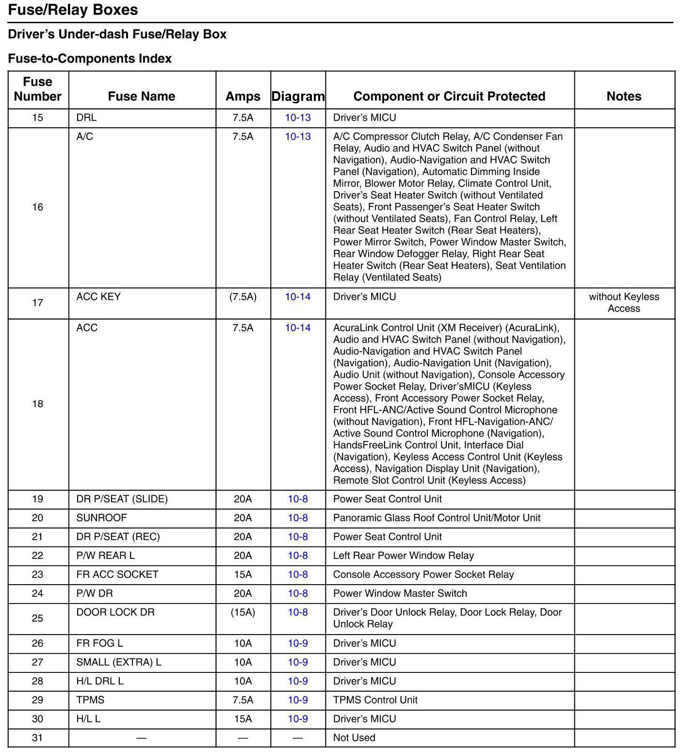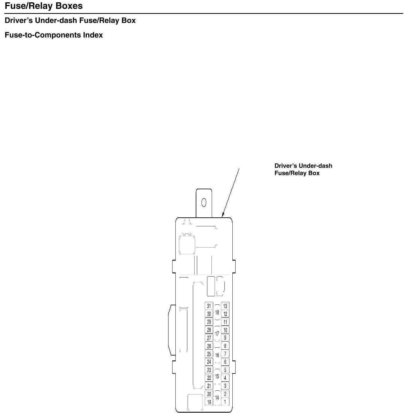Driver's Under-Dash Fuse/Relay Box - Fuse-to-Components Index