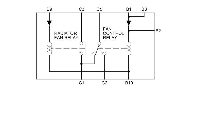 There should be continuity between terminals C2 and C5 when battery power is connected to terminal B1(, B2, or B8), and body ground is connected to terminal B10. There should be no continuity between terminals C2 and C5 when power is disconnected.