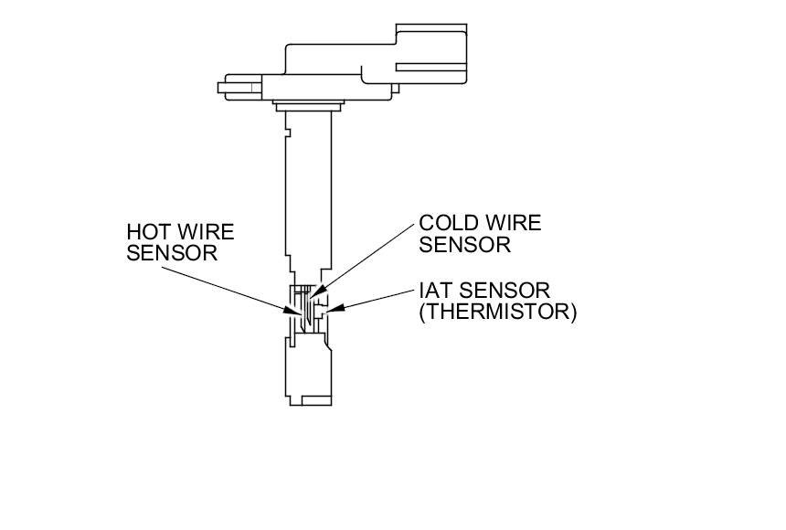 The mass air flow (MAF) sensor/intake air temperature (IAT) sensor contains a hot wire sensor, a cold wire sensor, and a thermistor. It is located in the intake air passage. The resistance of the hot wire sensor, the cold wire sensor, and the thermistor changes due to intake air temperature and air flow. The control circuit in the MAF sensor controls the current to keep the hot wire at a set temperature. The current is converted to voltage in the control circuit, then output to the PCM.
