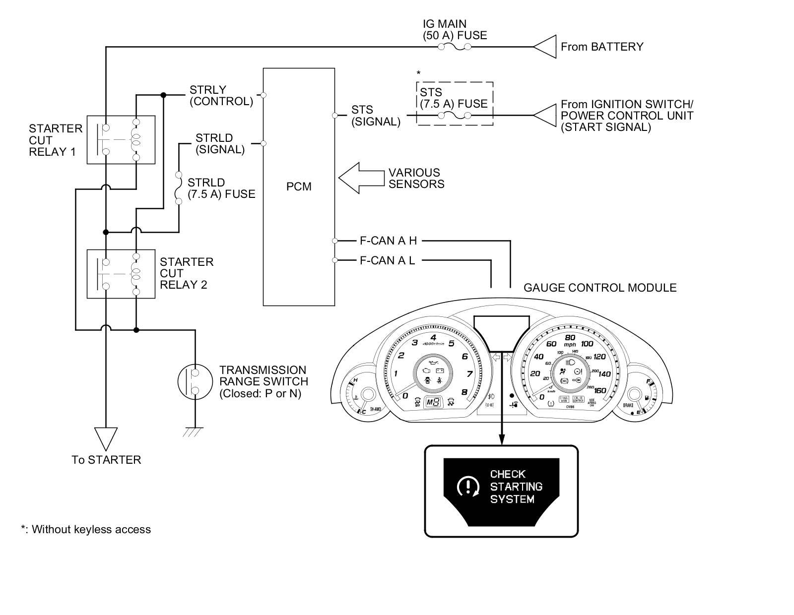 - When the ignition switch is turned to START (III), or the engine start/stop button is pressed to select the START mode, the PCM applies current to starter cut relay 1 and starter cut relay 2, then battery voltage is applied to the starter solenoid, and starter motor runs.