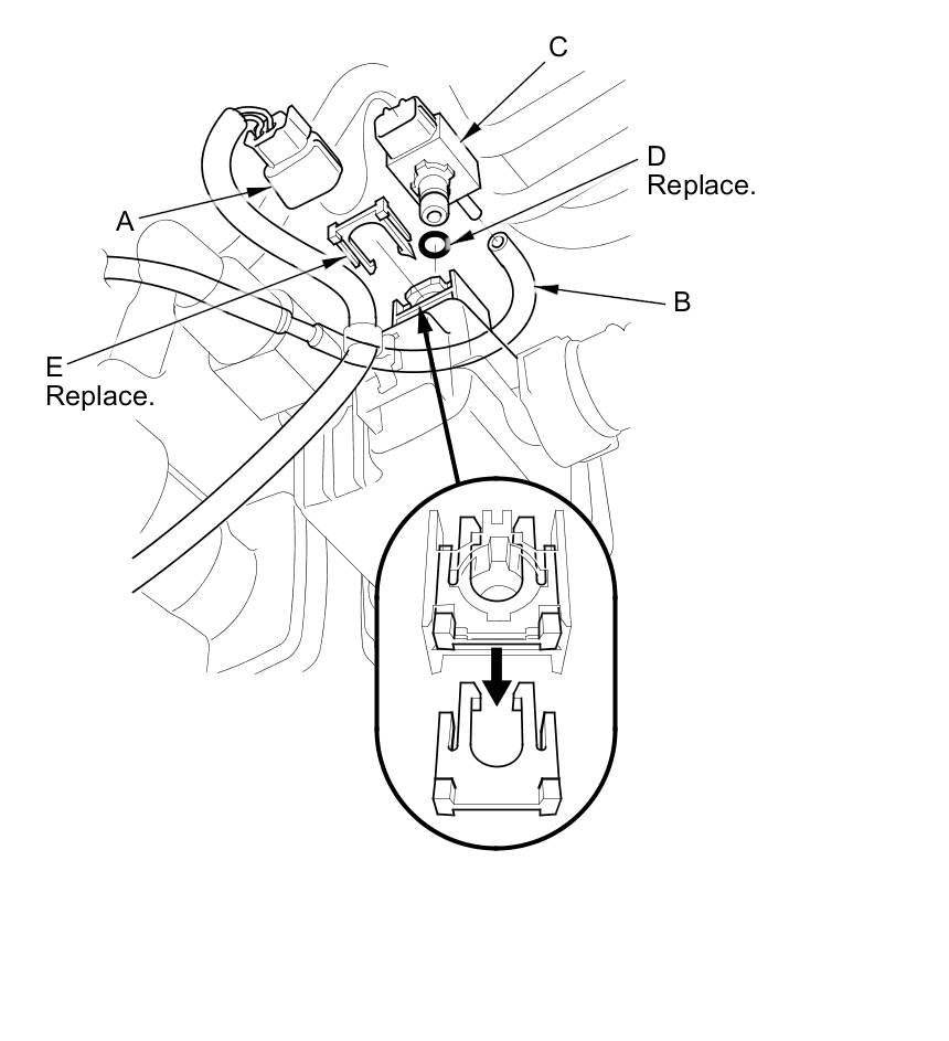 5. Install the parts in the reverse order of removal with a new O-ring (D) and a new retainer (E).