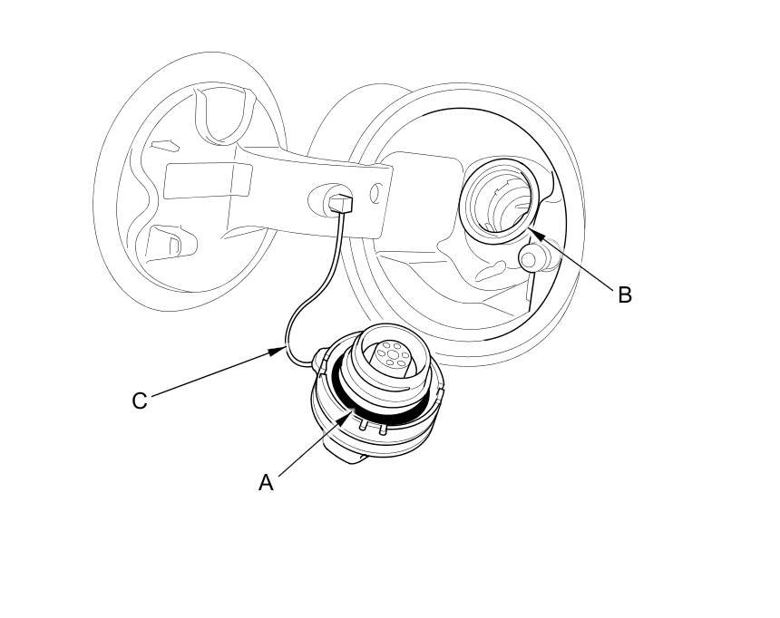 2. Check the fuel fill cap seal (A) and the fuel fill pipe mating surface (B). Make sure that the fuel fill cap tether cord (C) is not caught under the cap.