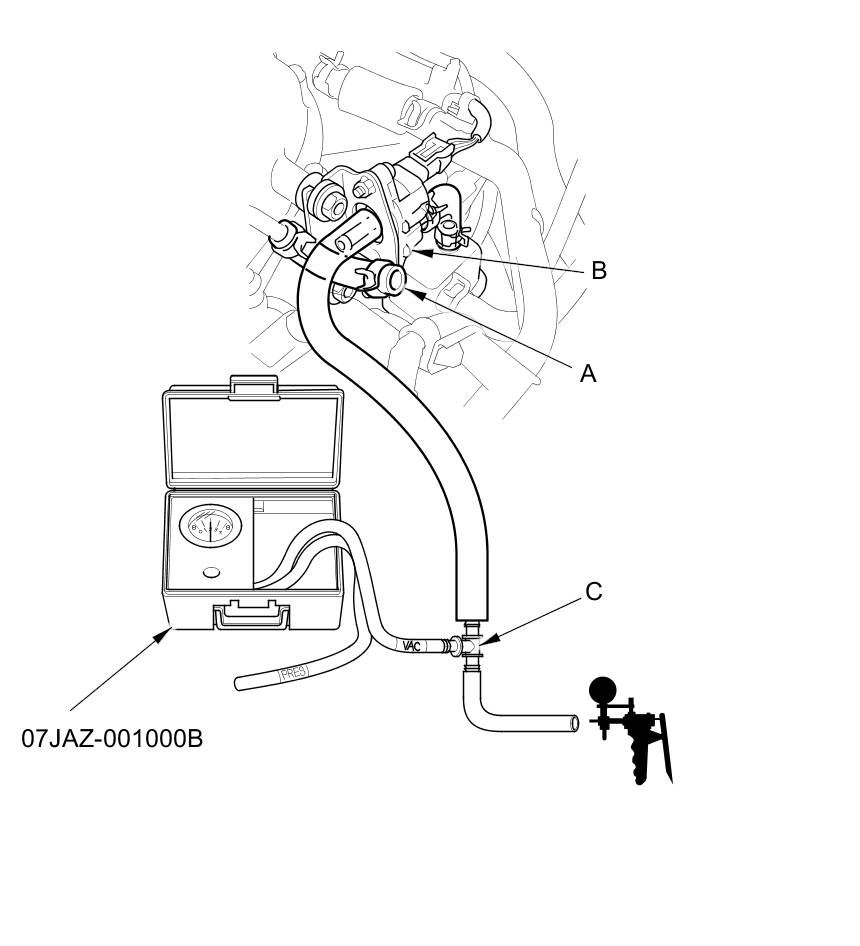 8. Disconnect the vacuum hose (A) from the EVAP canister purge valve (B) in the engine compartment, then connect a T-fitting (C), a vacuum gauge, and a vacuum pump/gauge, 0-30 inHg, to the EVAP canister purge valve as shown.