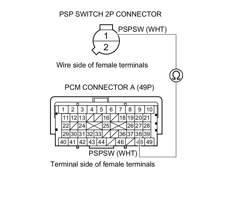 22. Check for continuity between PCM connector terminal A38 and PSP switch 2P connector terminal No. 1.