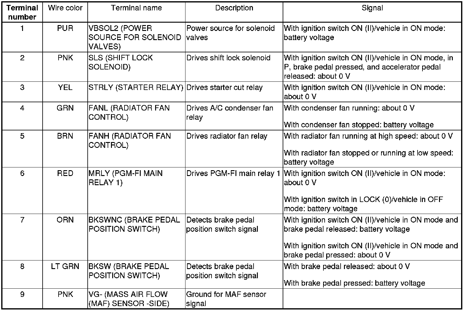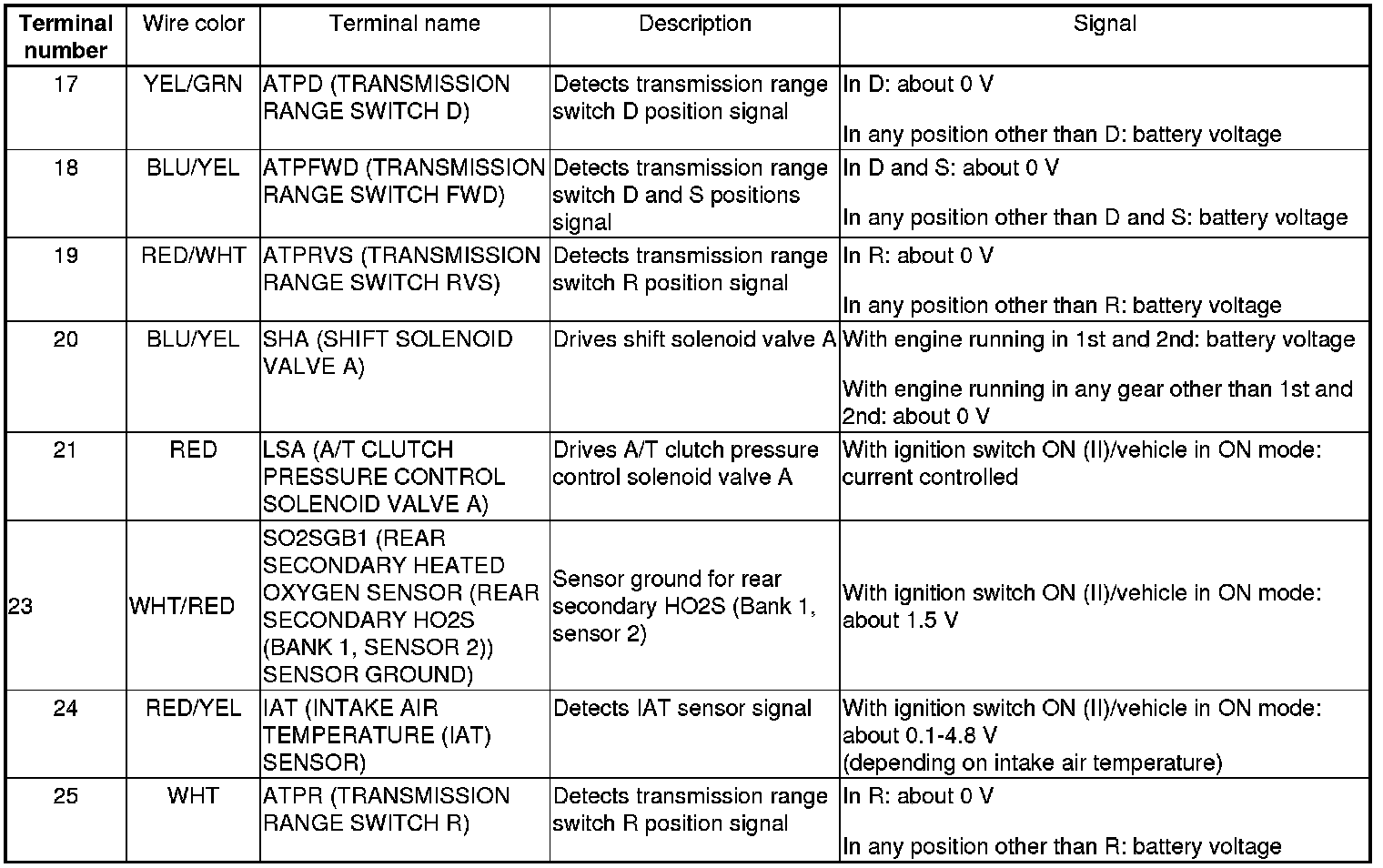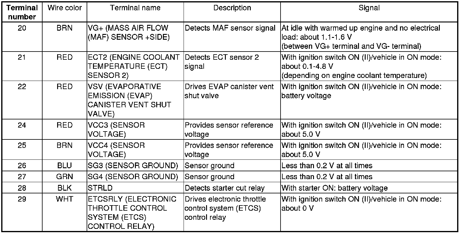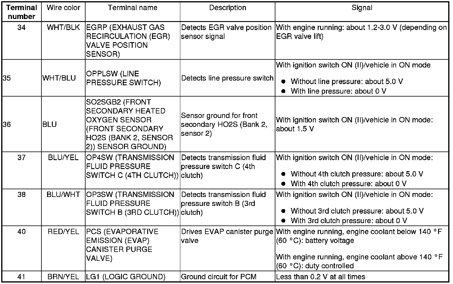 PCM Inputs and Outputs at PCM Connector A (square) (49P)