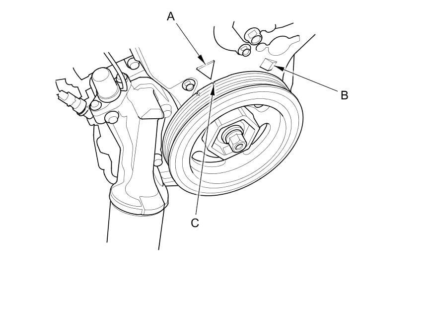 9. Aim the light toward the pointer (A) on the timing belt lower cover. Check the ignition timing under a no load condition (headlights, blower fan, rear window defogger, and air conditioner are turned off).