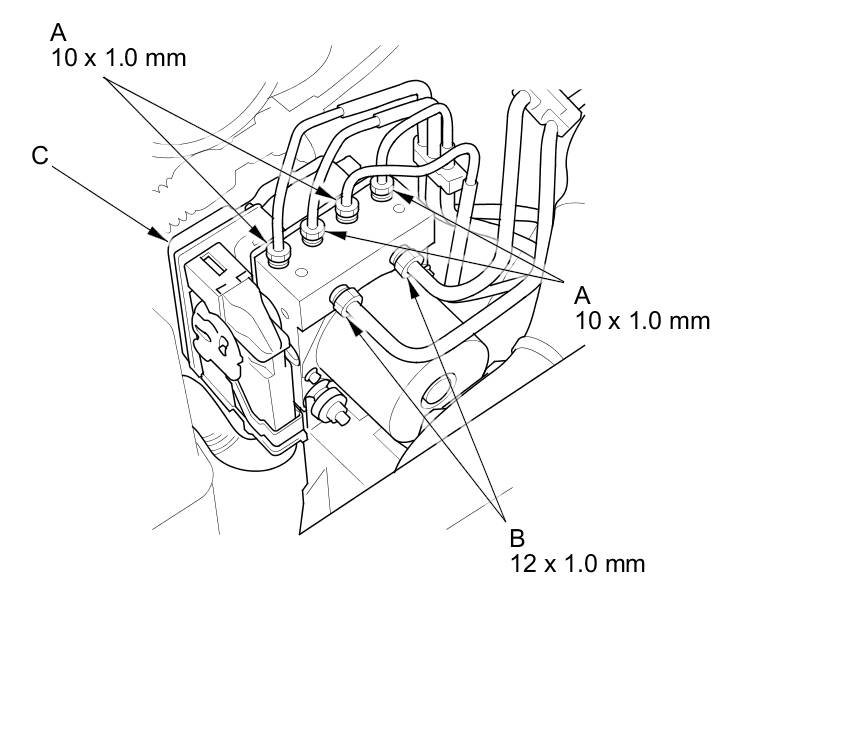 3. Disconnect the 10 mm brake lines (A) and the 12 mm brake lines (B) from the VSA modulator-control unit (C).