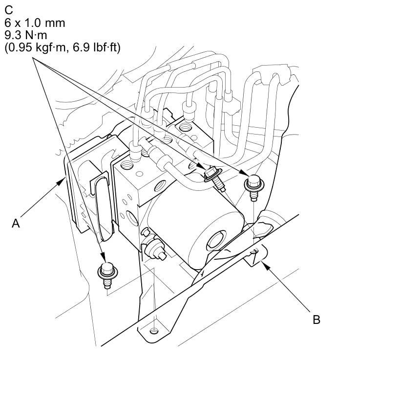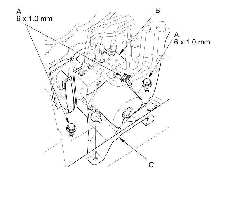 3. Install the VSA modulator-control unit (A) with the bracket (B) to the body, then install the VSA modulator-control unit bracket mounting bolts (C).