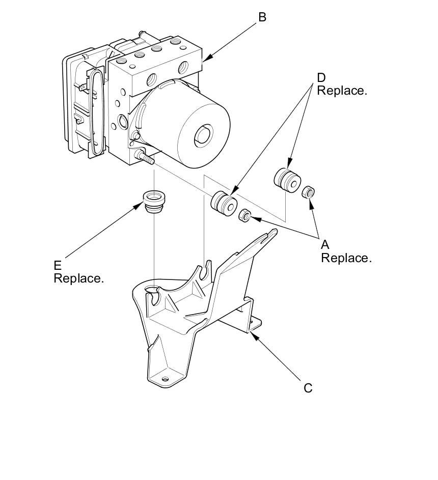 1. Install the new rubber dampers (A) and the new grommet (B) to the VSA modulator-control unit (C) (otherwise, unwanted noise and vibration may be transmitted to the vehicle).