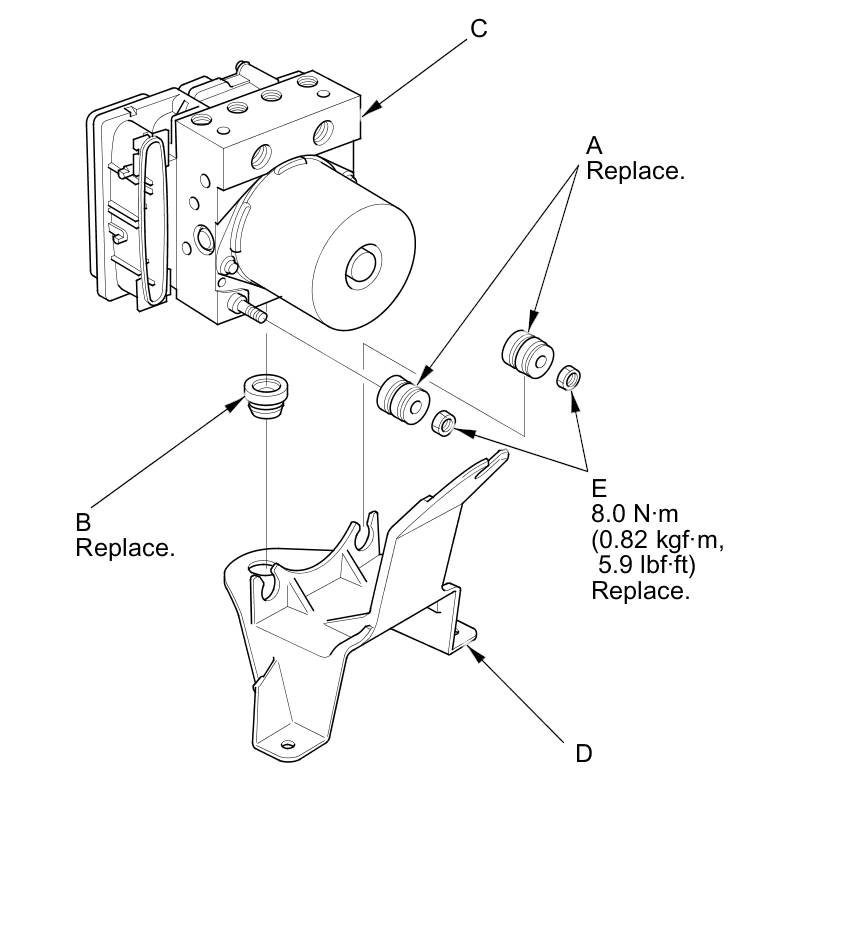 2. Install the VSA modulator-control unit on the bracket (D), then install the new locknuts (E).