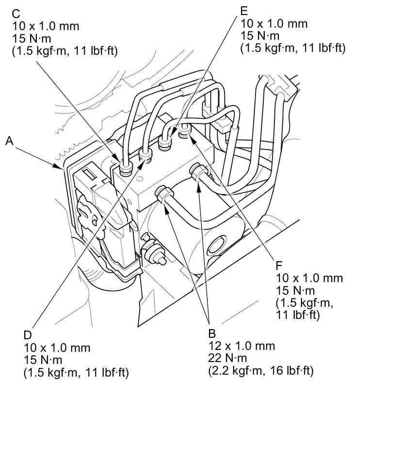 6. Connect the 10 mm brake lines and the 12 mm brake lines to the VSA modulator-control unit (A).