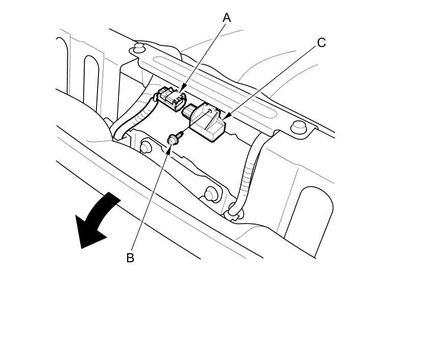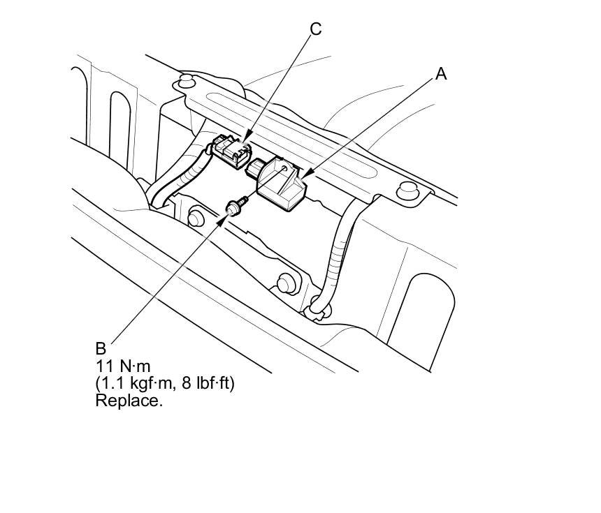 1. Install the rear safing sensor (A) with the new TORX bolt (B) using a TORX T30 bit. Connect the rear safing sensor 2P connector (C) on the floor wire harness.