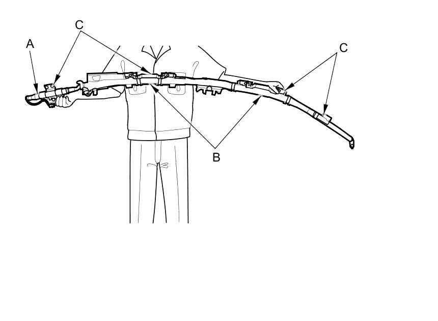 - The side curtain airbag module assembly is a long, jointed part containing an inflator (A), a flexible bag (B), and brackets (C). When removing or installing the side curtain airbag assembly, never: