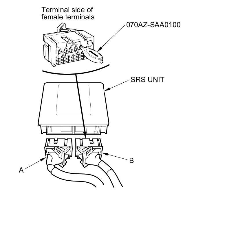 When diagnosing or troubleshooting at an SRS unit connector (A), use the terminal test port below the terminal you need to check. Gently insert the pin probes of the tester or jumper wire at the terminal test port from the terminal side.