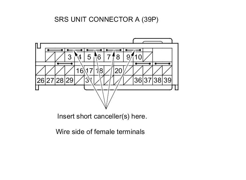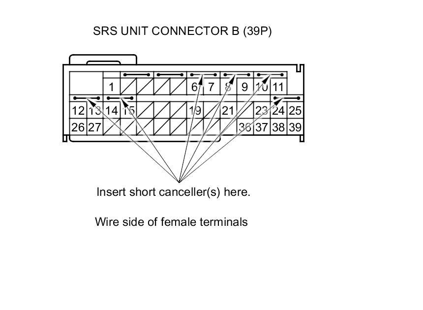 Terminal numbers are shown from the wire side of the female terminals. Insert the SRS short canceller(s) into the cavities on the terminal side of the connector.