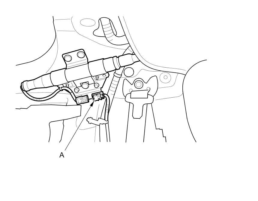 7. Disconnect the driver's and the front passenger's side airbag inflator 2P connectors (A) on the floor wire harness.