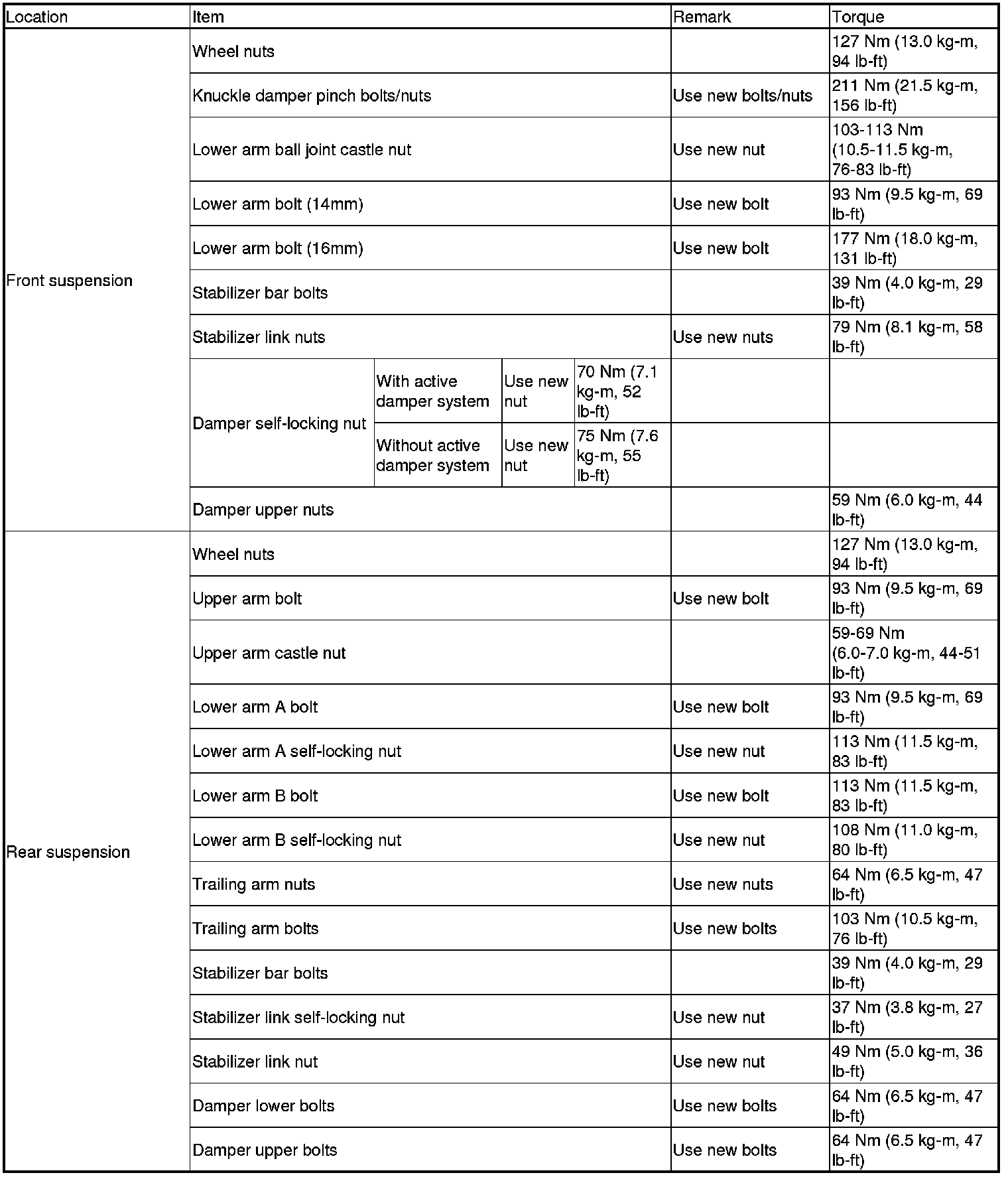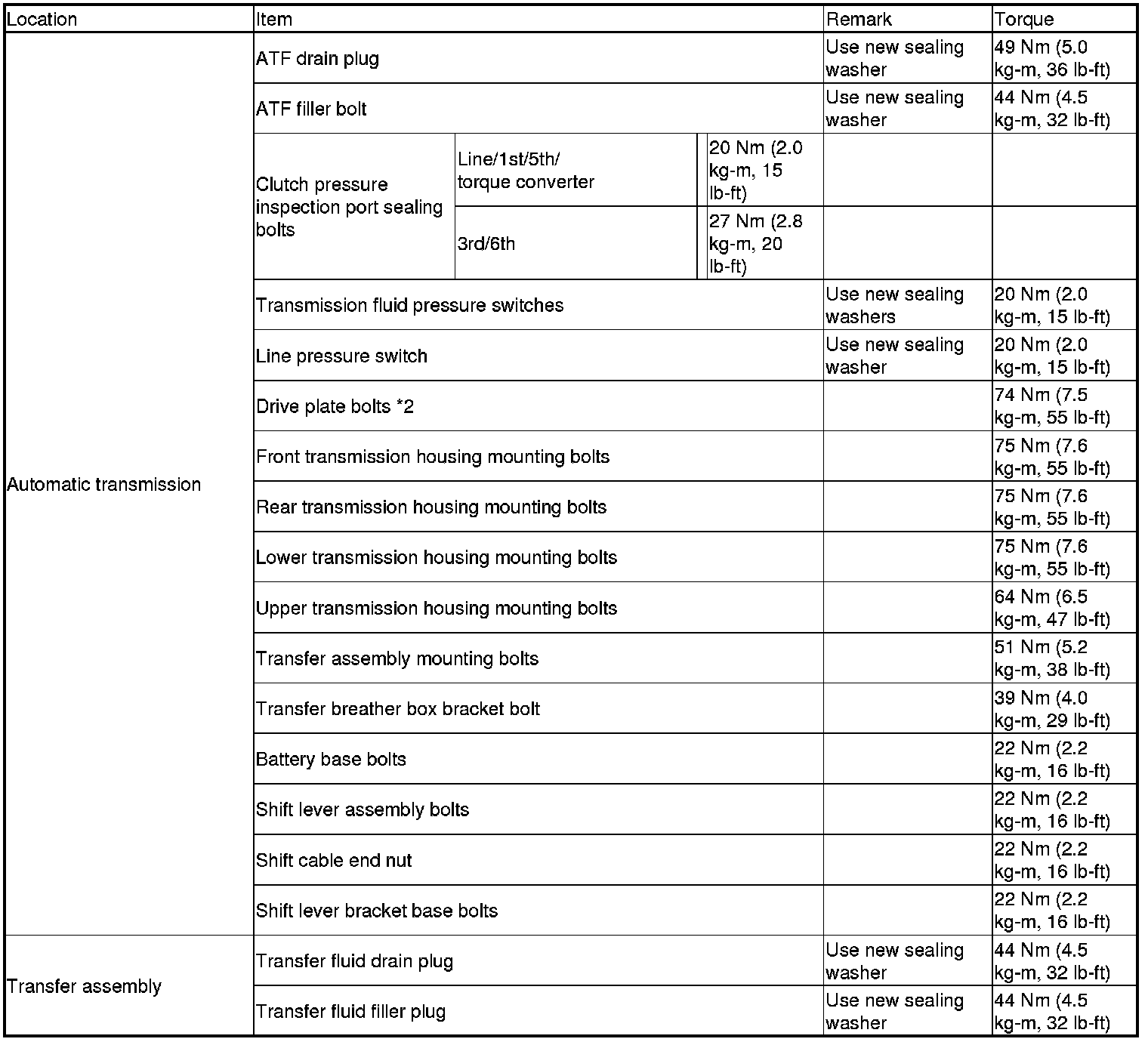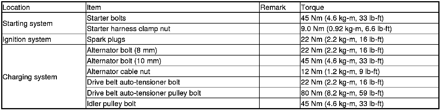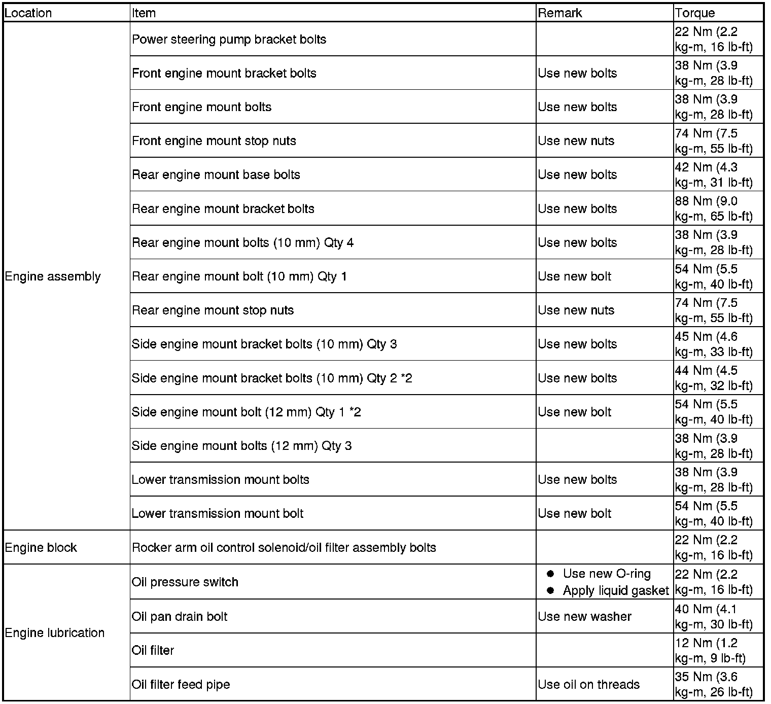 Torque Specifications (USA and Canada Models)