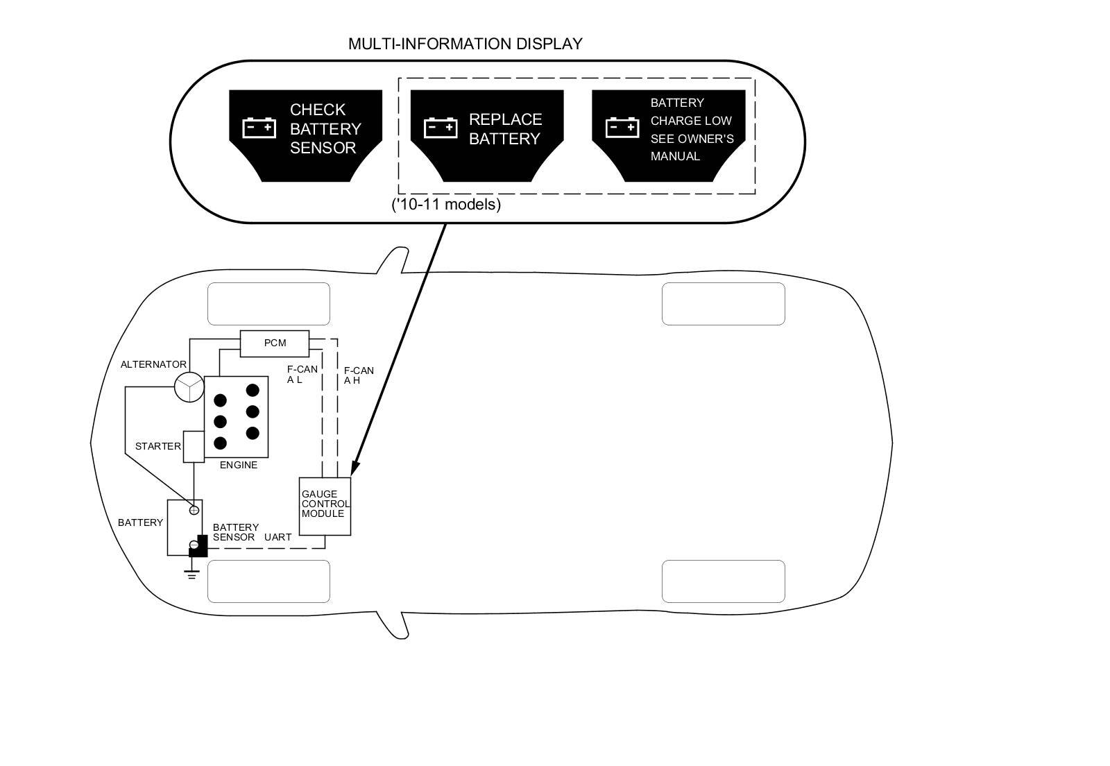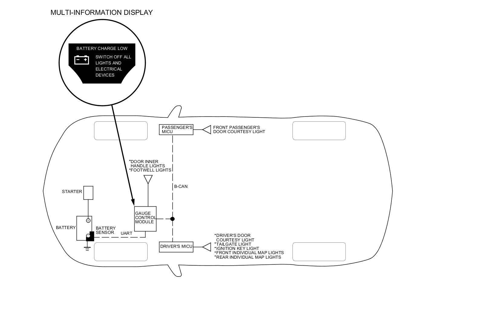 When the battery sensor detects the battery voltage decreasing, that information is sent to the gauge control module via the UART line. The gauge control module then operates a beeper, and displays the message Switch Off All Lights and Electrical Devices on the multi-information display (MID) to inform the client that electrical devices should be turned off. If electrical devices are not turned off and the battery voltage decreases more, the gauge control module sends an interior lights off signal to the driver's MICU and the passenger's MICU via the B-CAN line. Based on that signal, the units cut off the ground circuits of the interior lights and turn them off.