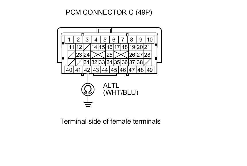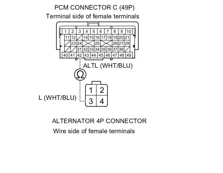 25. Check for continuity between PCM connector terminal C42 and alternator 4P connector terminal No. 3.