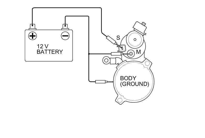 9. Connect the starter to the battery as shown, and confirm that the motor runs.