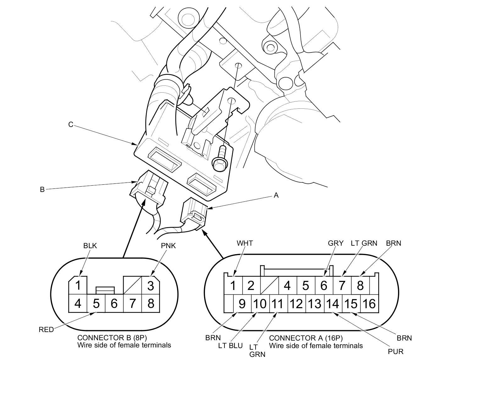 3. Disconnect the 16P connector (A) and 8P connector (B) from the power title/telescopic steering control unit (C).