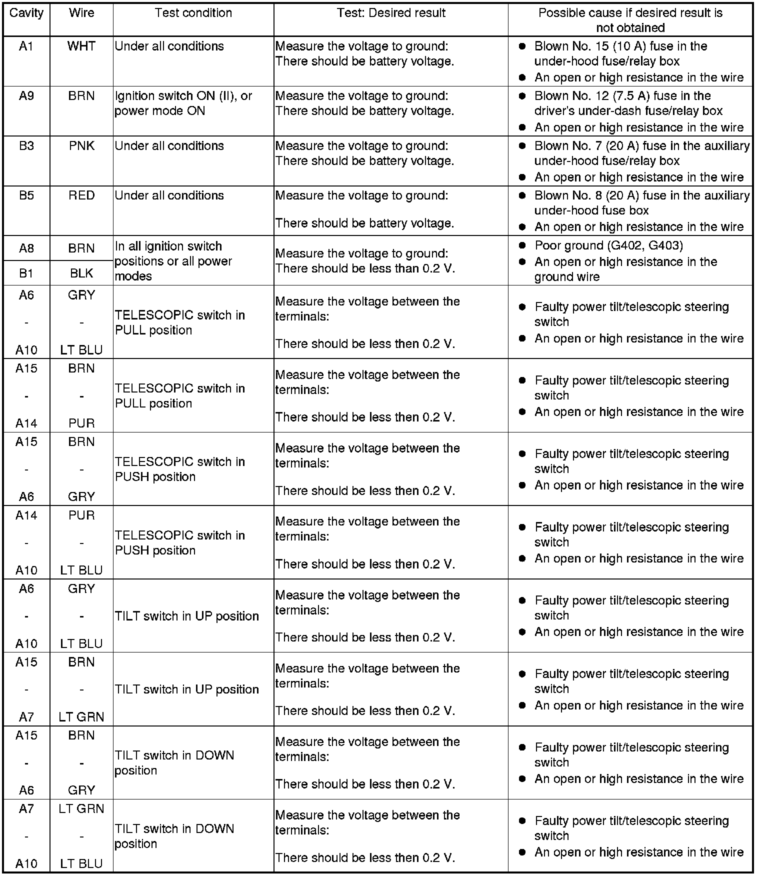5. Reconnect the connector to the power tilt/telescopic steering control unit, and do the following input tests: