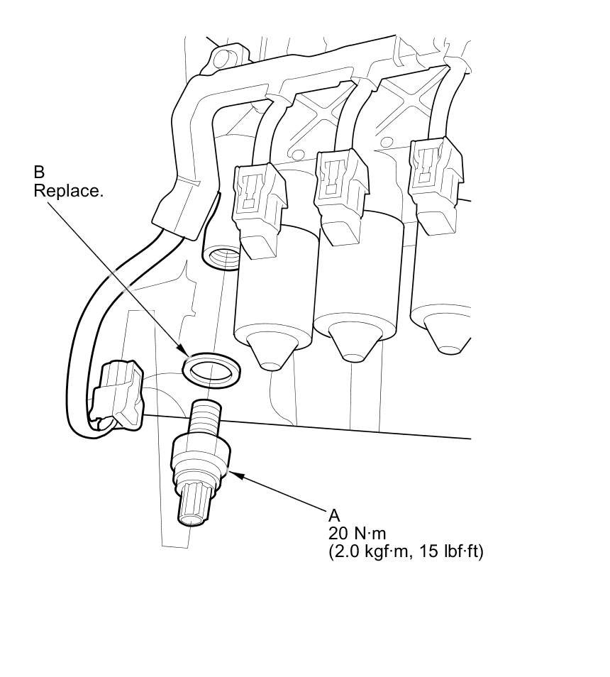 7. Disconnect the line pressure switch connector, and remove the line pressure switch (A) and the sealing washer (B).