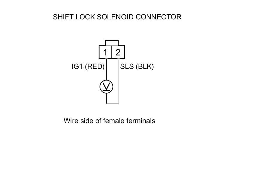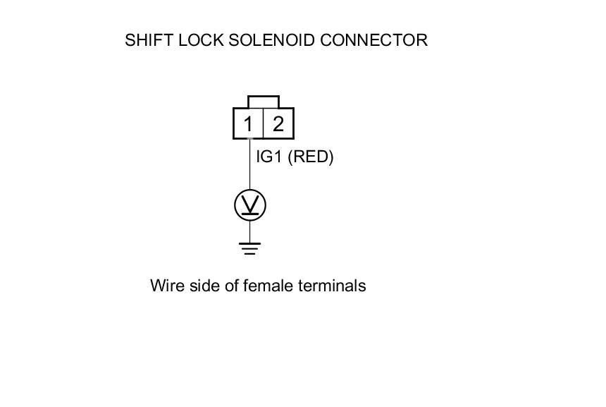 11. Release the brake pedal, and measure the voltage between shift lock solenoid connector terminals No. 1 and No. 2. The shift lever must be in P.