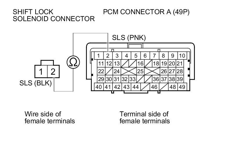 15. Check for continuity between PCM connector terminal A2 and shift lock solenoid connector terminal No. 2.