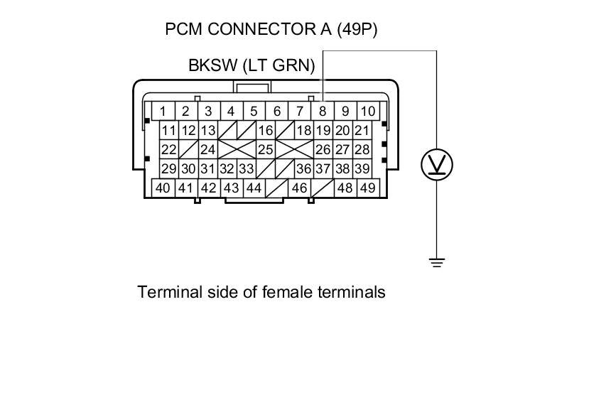 20. Measure the voltage between PCM connector terminal A8 and body ground while pressing the brake pedal and when the brake pedal is released.