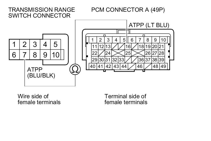 30. Check for continuity between PCM connector terminal A16 and transmission range switch connector terminal No. 7.
